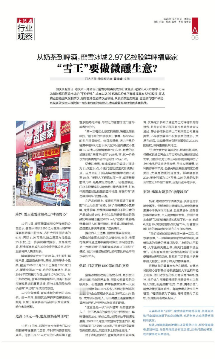 国庆长假首日,港交所一则公告让蜜雪冰城再度成为行业焦点。这家以4元柠檬水、6元冰淇淋横扫茶饮市场的“平价巨头”,宣布以2.97亿元总价拿下鲜啤福鹿家53%股权,正式将业务版图从现制茶饮、咖啡延伸至酒精饮品领域。从卖奶茶到卖啤酒,雪王的“买醉”举动,既是新茶饮巨头寻找第二增长曲线的战略尝试',也暗藏着跨界经营的多重挑战。