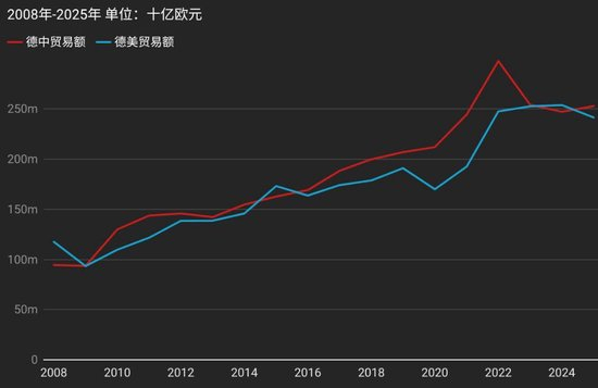 2008年至2025年,德国与中国及美国的贸易额数据。